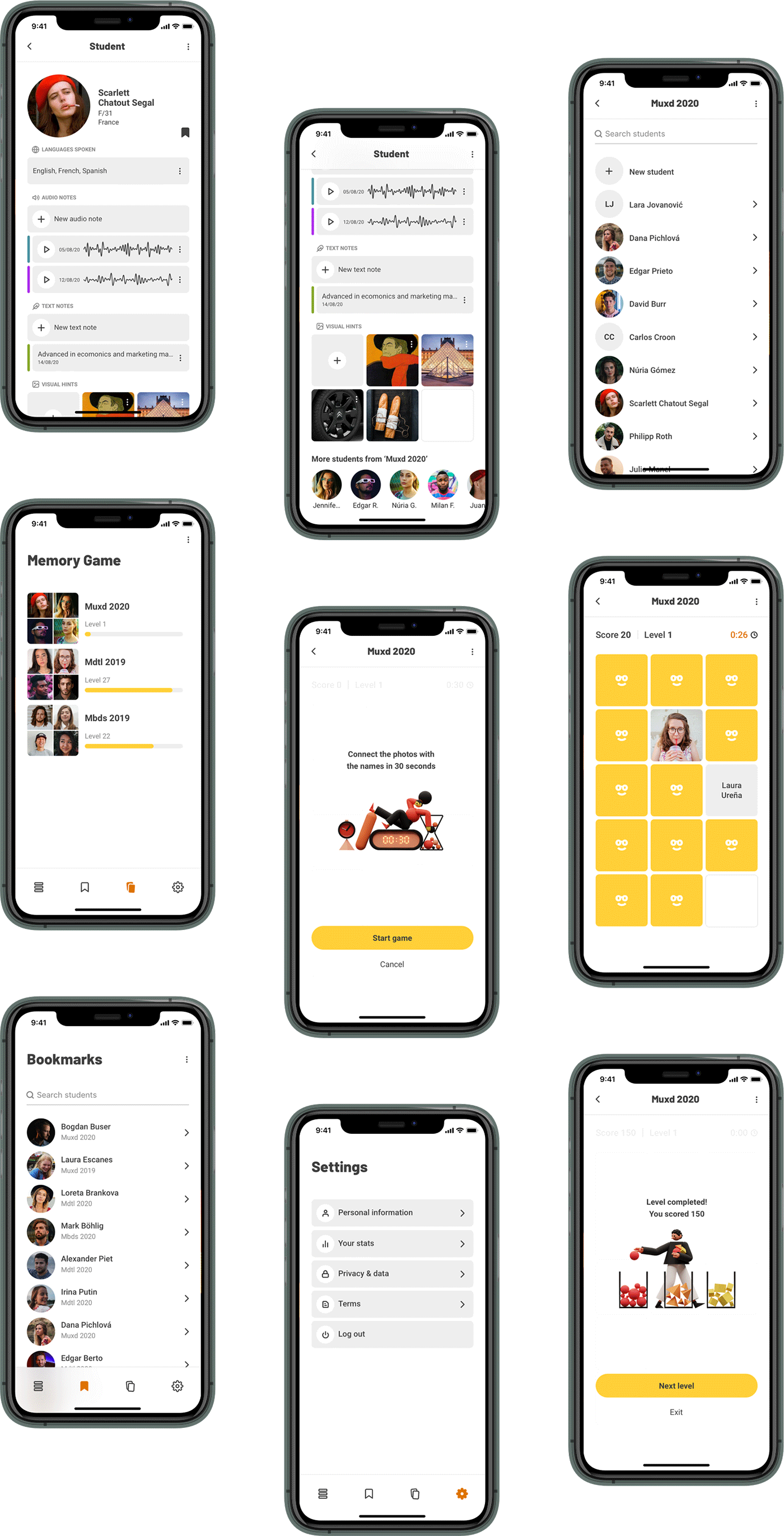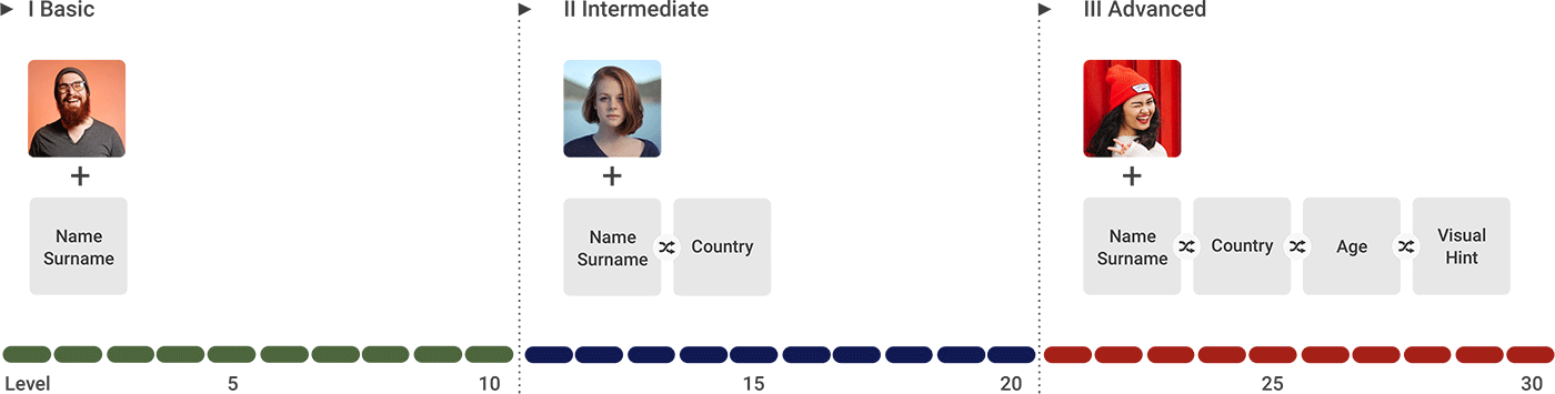 The game has 3 difficulty degrees: I Basic (Levels 1-10), II Intermediate (Levels 11-20), and III Advanced (Levels 21-30). In the Basic levels, a user has a task to connect a student’s photo with the right name. Later on, it becomes more complex, as a student’s photo needs to be connected with more random parameters such as Country, Age, or Visual Hint previously generated by a user in a student’s profile.